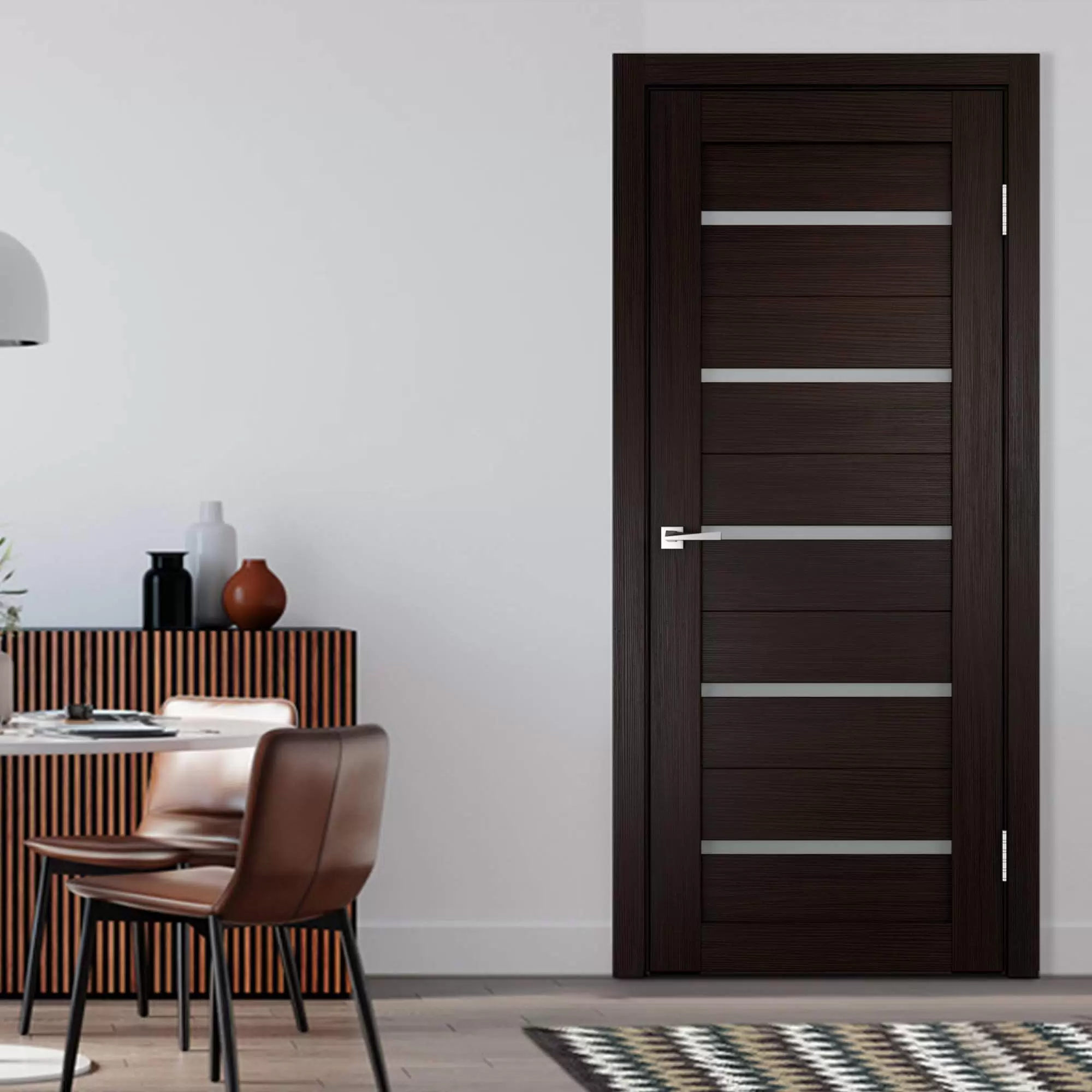 - Контраст как основа стиля. Венге — идеальный партнер для белых стен, светлого ламината или молочного текстиля. Дверь венге в белой стене — это не просто проем, это арт-объект. Она создает ту самую «осевую линию», которая делает интерьер графичным и дорогим.