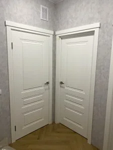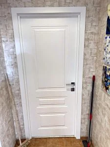 Белая эмаль в классическом стиле, поставили в гостиную. Глухая дверь - звукоизоляция на уровне.